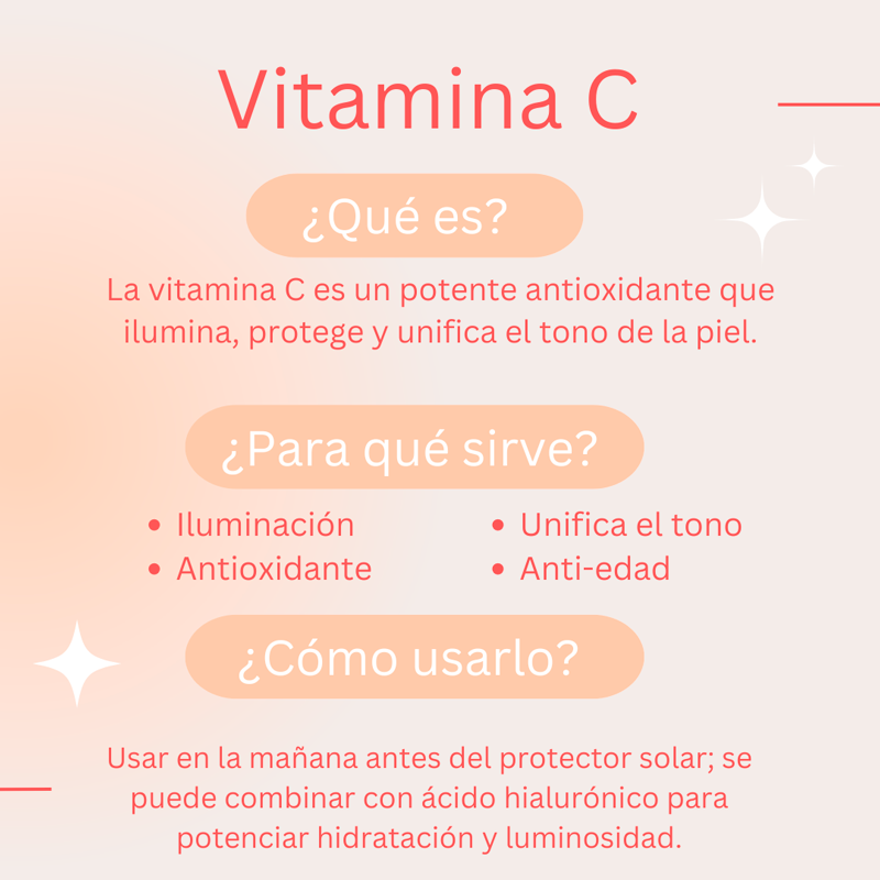 La vitamina C es una vitamina antioxidante que ayuda a devolver esa luminosidad a nuestra piel, empareja el tono y ayuda a tonificar.