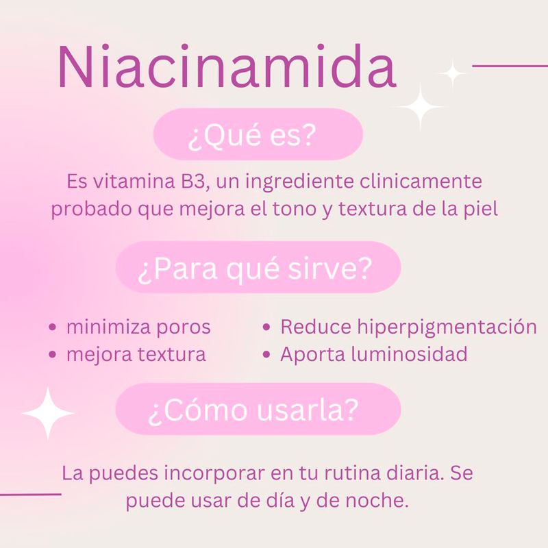 -Niacinamida 🌿 → Mejora el tono, refina la textura y fortalece la barrera cutánea.